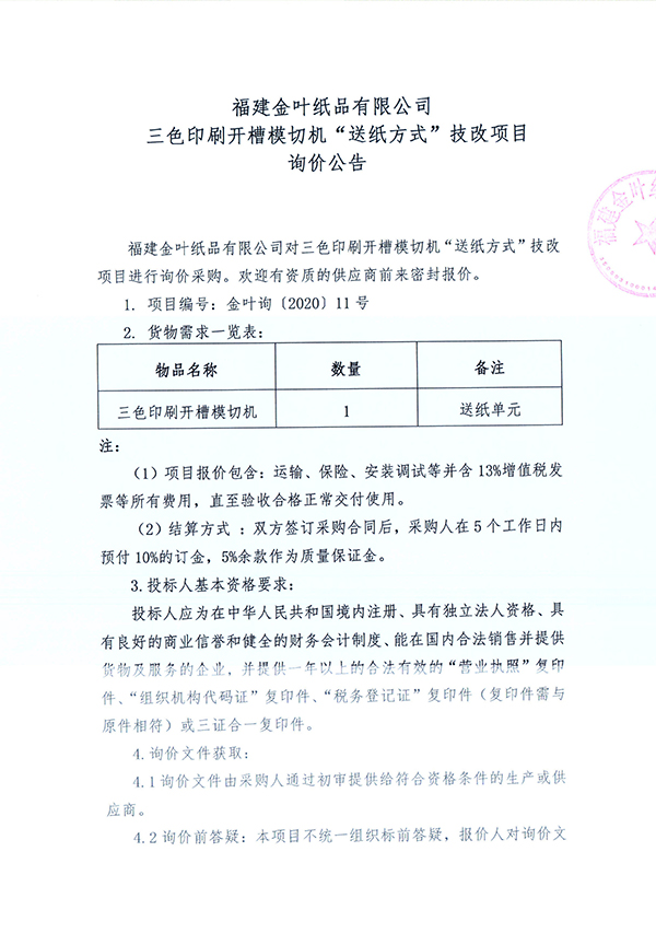 三色印刷開槽模切機“送紙方式”技改項目詢價公告