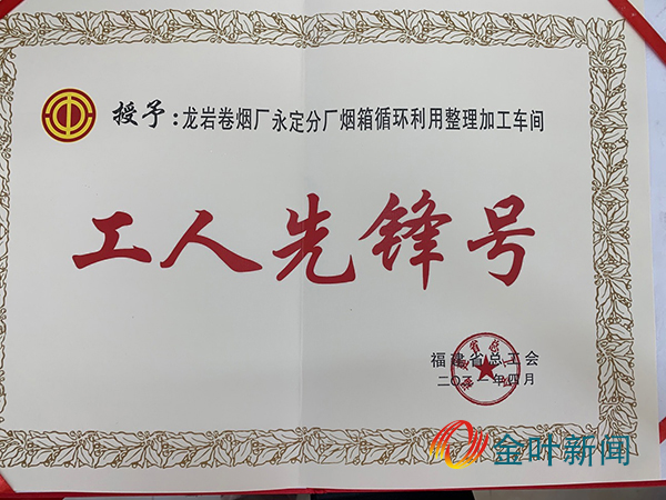2021年5月14日上午,永定區(qū)總工會黨組書記、副主席劉福華(右二),副主席盧銀玉(左一)在科研樓一樓大廳為我廠煙箱循環(huán)利用整理加工車間榮獲2020年度“省級工人先鋒號”舉行了授牌儀式。