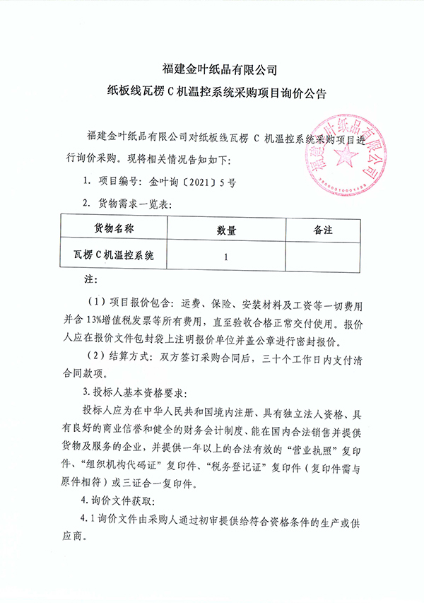 福建金葉紙品有限公司紙板線瓦楞C機溫控系統采購項目詢價公告