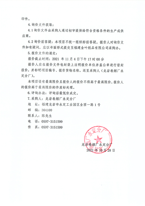 龍巖卷煙廠永定分廠物流車間設(shè)備房改造工程項(xiàng)目詢價(jià)公告