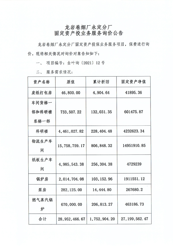 龍巖卷煙廠永定分廠固定資產(chǎn)投保業(yè)務(wù)服務(wù)項(xiàng)目詢(xún)價(jià)公告