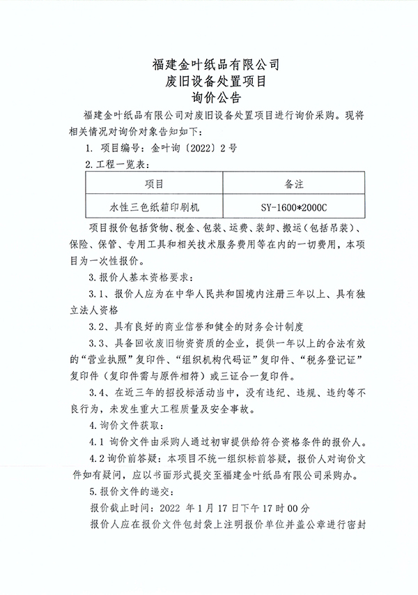 福建金葉紙品有限公司廢舊設備處置項目詢價公告