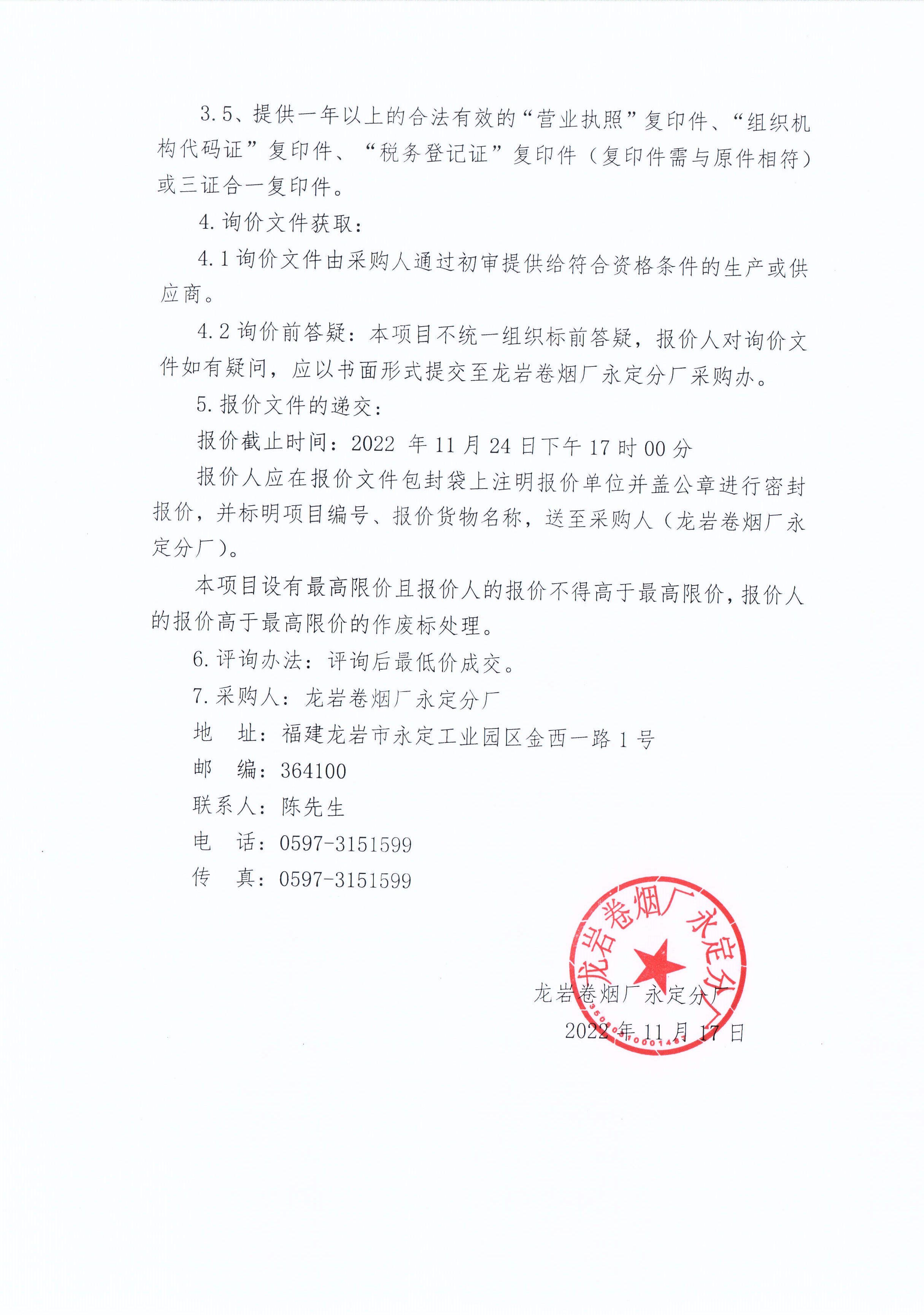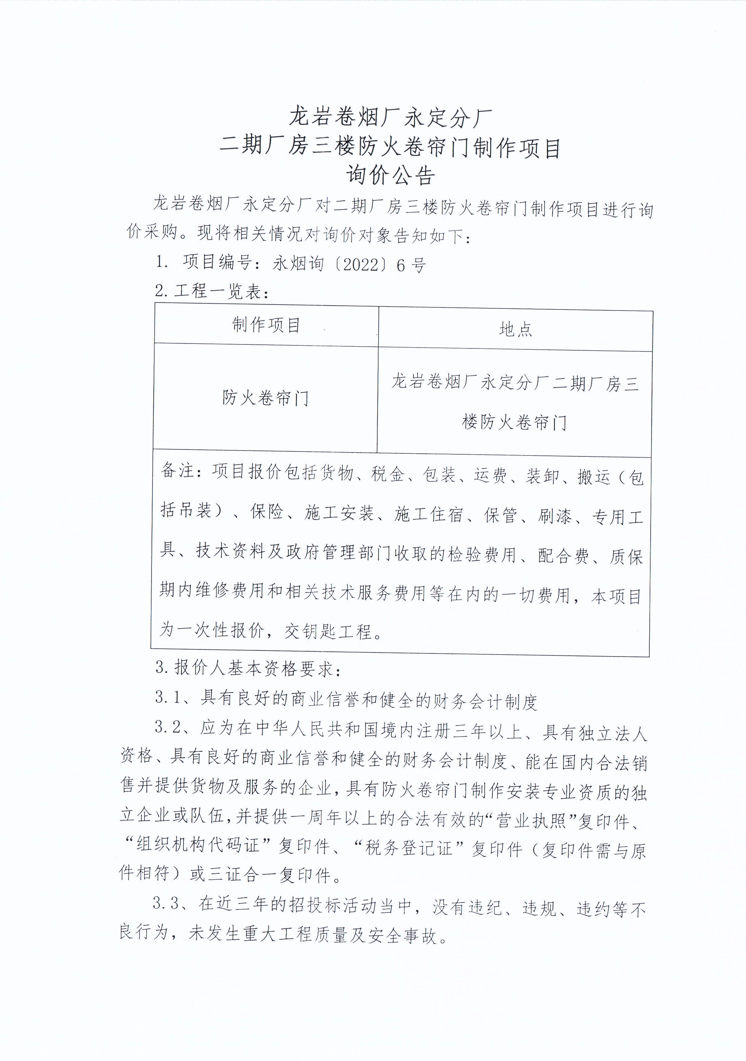 龍巖卷煙廠永定分廠二期廠房三樓防火卷簾門制作項目詢價公告