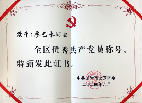 喜訊!龍巖卷煙廠永定分廠黨員廖藝永同志榮獲“全區優秀共產黨員”稱號